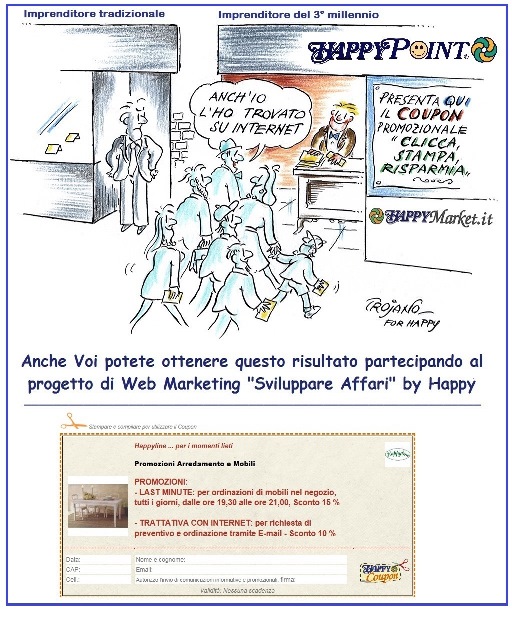 ... DIVENTA UN'IMPRESA DEL 3° MILLENNIO ! PARTECIPA SUBITO AD HAPPYMARKET, NELLE 4 RETI CORRELATE ALLE RICECHE DEI CONSUMATORI INTERNAUTI: RISPARMIO + CONSEGNA A DOMICIIO + VENDITA ONLINE + ACQUISTO AGEVOLATO NEL NEGOZIO CON I COUPONS PROMOZIONALI